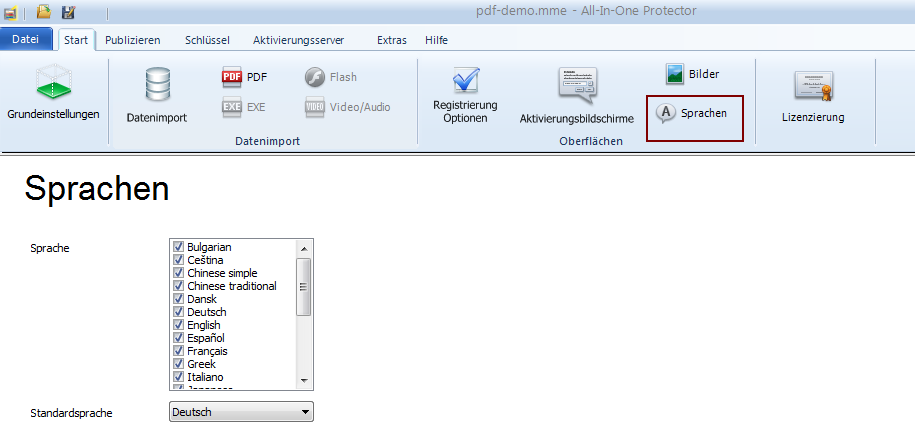 Wählen Sie eine oder mehrere Sprachen aus, welche in den Registrierungs- und Aktivierungsdialogen zur Verfügung stehen. Der Benutzer kann die von ihm bevorzugte Sprache im ersten Registrierungsdialog wählen.