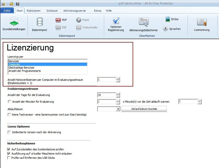 Wird Ihre Anwendung nur auf einem Einzelplatz betrieben, so wählen Sie den Lizenztyp "Computer" aus und setzen die "Anzahl der Computer im Evaluierungszeitraum" auf "1". In der Standard Version wird nur dieser Lizenztyp unterstützt. Für weitere Informationen zu diesem Lizenztyp klicken Sie hier.