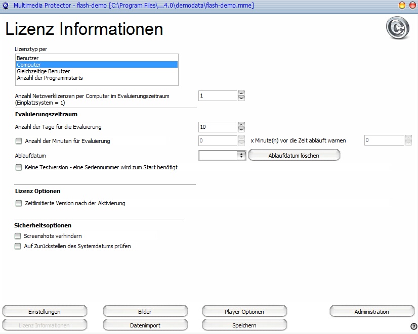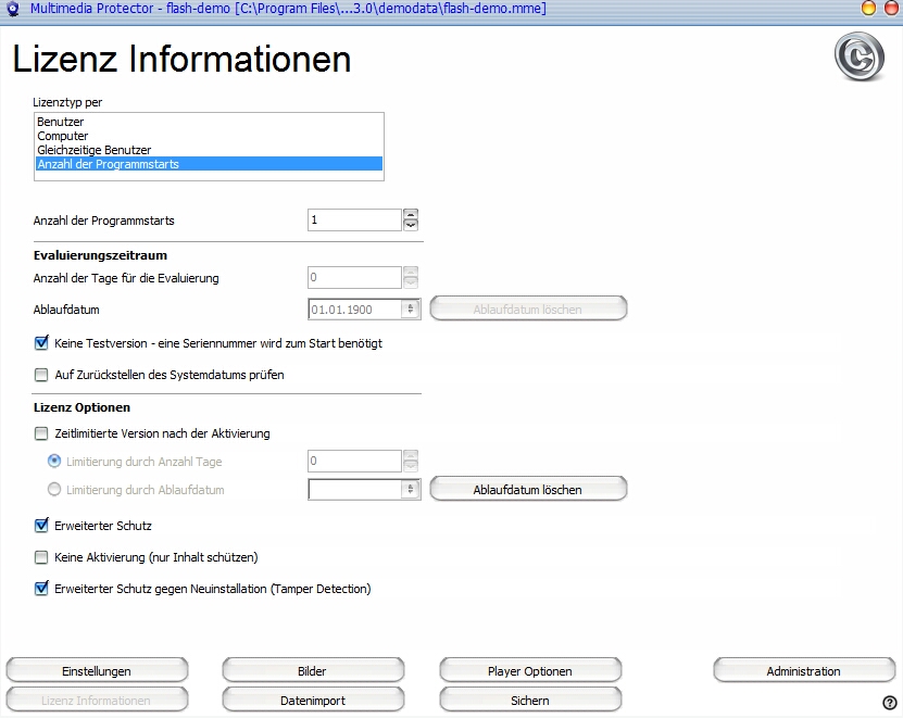Diese Option schränkt die Anzahl der Programmstarts ein. Sie ist sowohl für die Demoversion als auch für die Vollversion gültig. Sie können zusätzliche Schlüssel erstellen, um weitere Programmstarts zu ermöglichen.