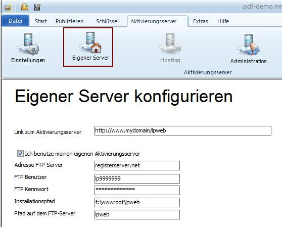 Führen Sie den Aktivierungsserver auf Ihrem eigenen Server aus, so können Sie die Konfigurationsdateien automatisch zum Aktivierungsserver hochladen. Diese Funktionalität benötigt jedoch eine spezielle Konfiguration des Servers. Andernfalls können Sie die Konfigurationsdateien auch manuell zum Aktivierungsserver hochladen.