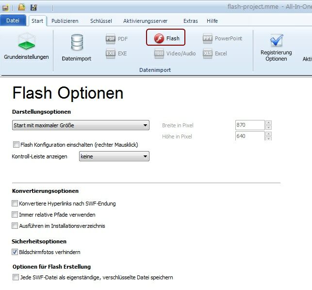 Der All-In-One Player verwendet die Bildschirmauflösung der zu startenden SWF Datei.