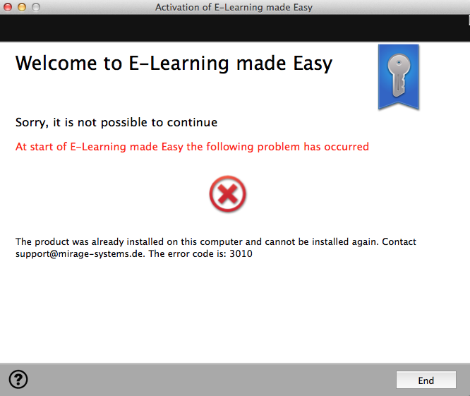 Dieser Fehler erscheint, wenn das Produkt bereits auf dem Rechner installiert war und die Lizenzdatei gelöscht wurde. Nachdem die Anwendung erneut gestartet wird, wird eine neue Lizenzdatei vom Aktivierungsserver heruntergeladen und der Zähler für die maximale Anzahl der Installationen erhöht. Wenn die maximale Anzahl pro Rechner erreicht ist, wird die nachfolgende Meldung angezeigt.