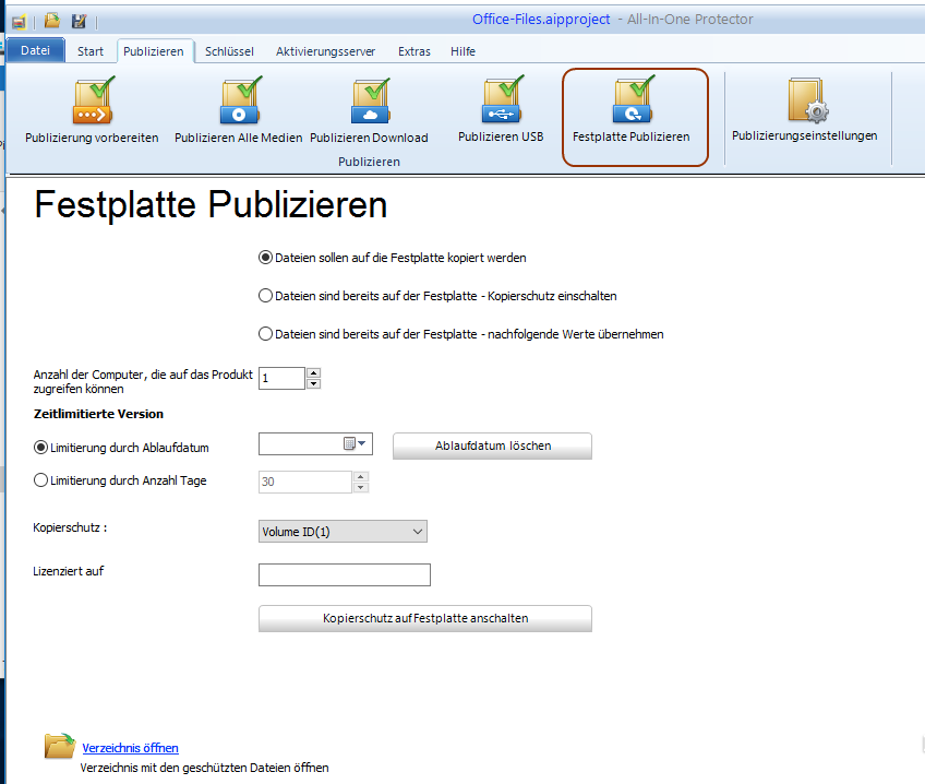 Wählen Sie die Kopierschutz Option. Volume ID (1) sollte in größeren Netzwerken verwendet werden da der Festplattenname immer ermittelt werden kann.