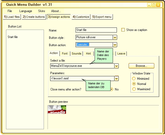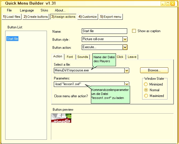 Nach Erstellung der einzelnen Schaltflächen, können Sie diesen über die Registerkarte Assign actions, den aus der Datenbank zu startenden Dateien zuweisen. Wählen Sie hierzu im Feld Execute den Pfad und Namen Ihrer All-In-One Player.exe aus. Es ist die Datei mit dem blauen Schutzschild.