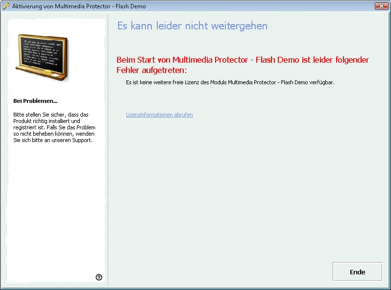 Sollte der All-In-One Player mit einer Netzwerklizenz genutzt, jedoch von mehreren als in der Kategorie "Lizenz Informationen" definierten Benutzer/ PCs gestartet werden, wird nachfolgender Dialog angezeigt. Es ist nicht möglich fortzufahren.