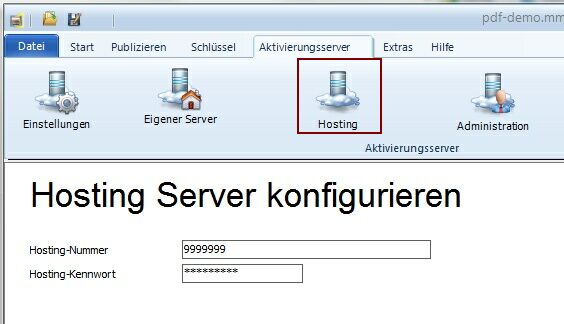 Nutzen Sie das Hosting des Aktivierungsserver, so hinterlegen Sie Ihre Hosting-Nummer sowie das zugehörige Hosting-Kennwort. Diese Eingaben sind zum Hochladen der Konfigurationsdateien auf den Aktivierungsserver erforderlich. Wenn die Hosting Nummer gelöscht wird, werden die Daten für den Demoserver eingesetzt. Ihre Zugangsdaten erhalten Sie nach der Bestellung eines Hostings.