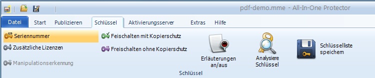 Hier können Serien Nummern, Freischaltschlüssel oder zusätzliche Aktivierungsschlüssel wie ein Schlüssel zur Verlängerung der Demoversion erstellt werden.