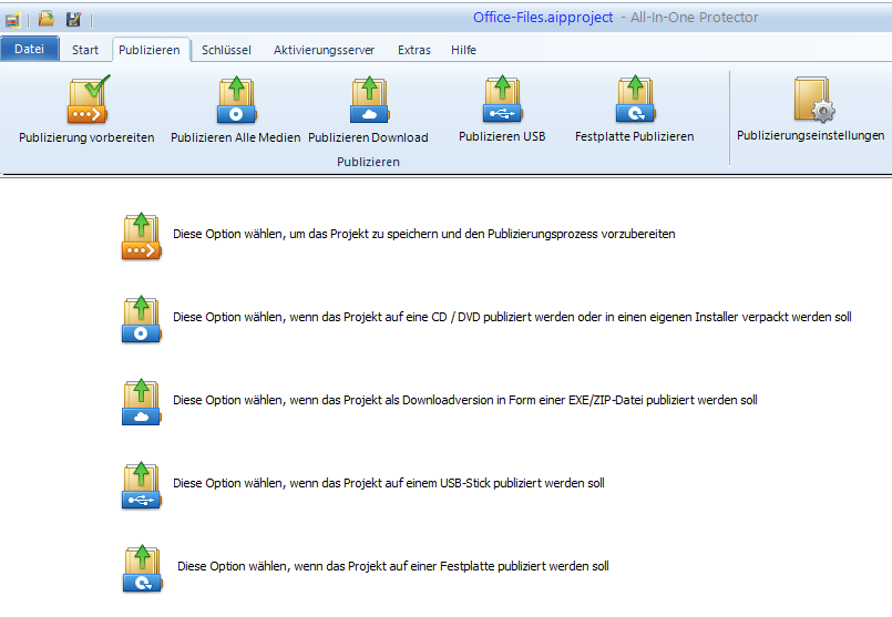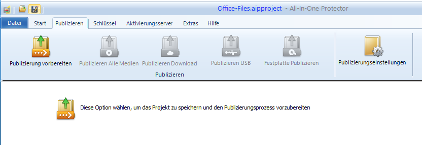Der erste Schritt ist die Publizierung vorzubereiten. Dies erstellt die Projektdateien, die dann per CD oder eigenem Installationspaket, USB-Stick , Download Version oder Festplatte ausgeliefert werden können. Je nach Projektgröße kann dieser Schritt mehrere Minuten dauern. Die anderen Optionen sind verfügbar, sobald die Vorbereitung abgeschlossen ist.