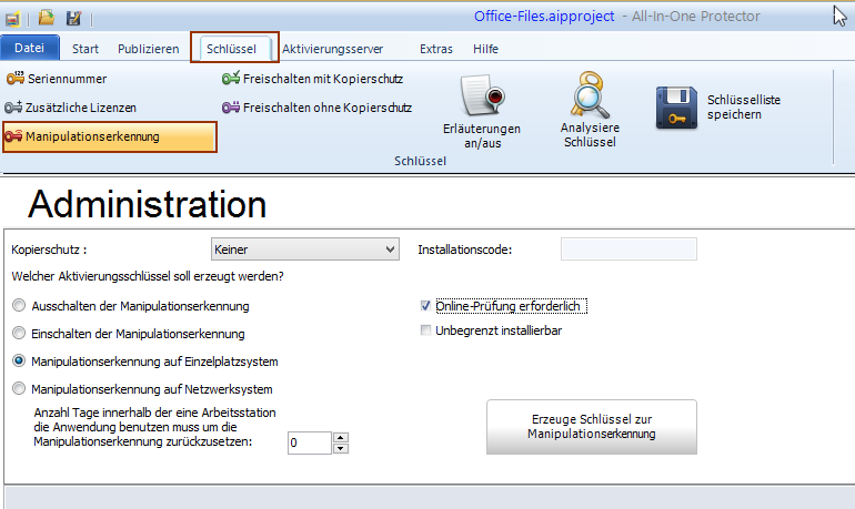 •Wählen Sie Online-Prüfung erforderlich um sicherzustellen, dass der Schlüssel nicht auf mehreren Rechnern verwendet werden kann