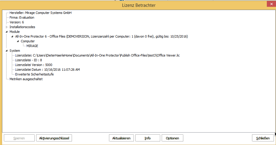 Der Lizenz Betrachter ist eine komplette administrative Benutzeroberfläche und Bestandteil des All-In-One Player. Er kann während des Registrierungsvorgangs aus jedem Dialogfenster heraus gestartet werden. Klicken Sie hierzu auf den Link "Lizenzdaten anzeigen".