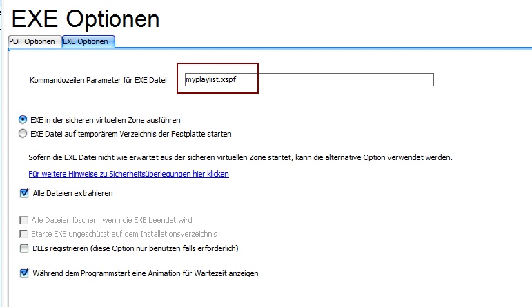 Klicken Sie auf die Schaltfläche Optionen, TAB Reiter EXE Optionen. Geben Sie den Namen der Wiedergabeliste, die nach dem Start angezeigt werden soll, als Kommandozeilenparamter ein.