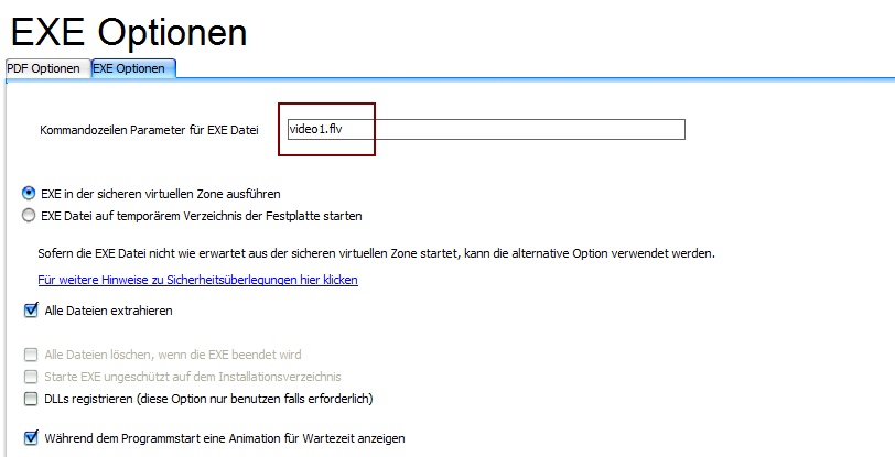 Klicken Sie auf die Schaltfläche Optionen, TAB Reiter EXE Optionen. Geben Sie den Namen der Video Datei, die nach dem Start angezeigt werden soll, als Kommandozeilenparamter ein.