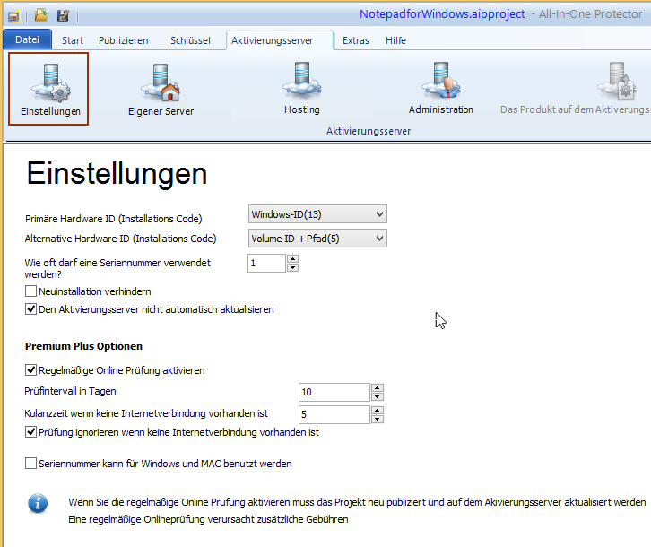 Sie können die Projekt Einstellungen im Detail auf dem Aktivierungsserver innerhalb der Produkt Konfiguration ändern.