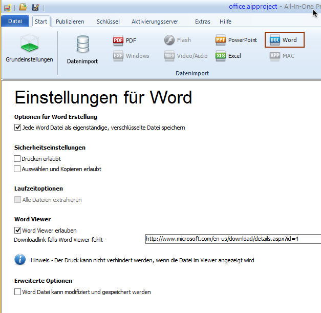 Wenn der Word Viewer verwendet werden kann, erhält der Benutzer eine Nachricht, sofern Word nicht auf seinem Computer installiert ist. Der Download Link sollte zum aktuellen Word Viewer gehen. Sie können den Link ändern sofern es eine neue Word Viewer Version gibt.