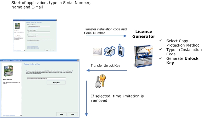 Durch Nutzen dieser Aktivierungsmethoden, muss Ihnen der Kunde einen Installationscode (8 stellige Hardware ID), sowie die Seriennnummer, den Kundennamen und E-Mail Adresse zusenden. Hiernach senden Sie dem Kunden einen Freischaltschlüssel (Freischaltschlüssel mit Kopierschutz) zu. Dieser kann innerhalb der Kategorie "Administration / Freischaltschlüssel erstellen" erzeugt werden. Handelt es sich um eine zeitlimitierte Version, so wird die Zeitlimitierung nach Eingabe des Freischaltschlüssels entfernt.