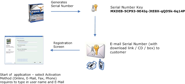 Nach Erhalt der Seriennummer, kann der Kunde aus bereits definierten Aktivierungsmethoden wählen (Online, E-Mail, Fax, Telefon) und registriert die Sofware durch Eingabe der Seriennummer, Name und E-Mail Adresse.