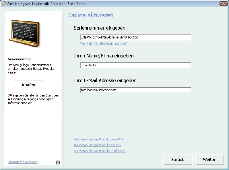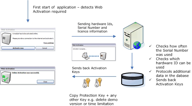 Die Hardware IDs und Seriennummer werden an den Aktivierungsserver übertragen, geprüft und in einer Datenbank gespeichert. Wurde die Seriennummer zuvor nicht verwendet, so wird der Kopierschutz aktiviert und die Zeitlimitierung entfernt. Dies erlaubt die unlimitierte Nutzung der Anwendung.