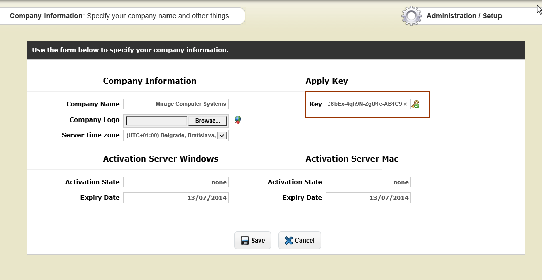 | • | Type in the Serial Number in the field: Apply Key and click on |