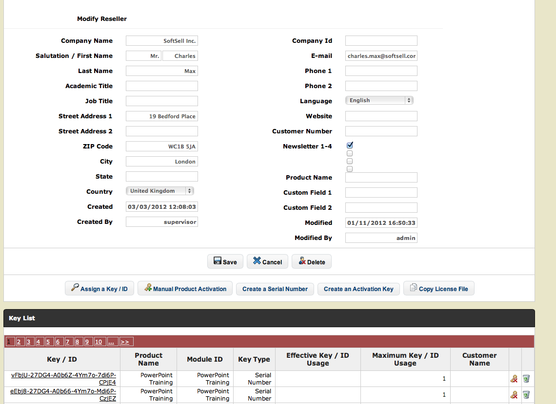 Manage and administrate resellers and the keys / customers associated with an reseller.