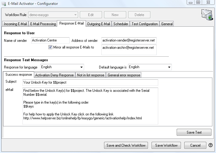 •Activation response. This message is sent out in case the E-Mail activation failed, e.g. because the Serial Number / ID was already used or was locked