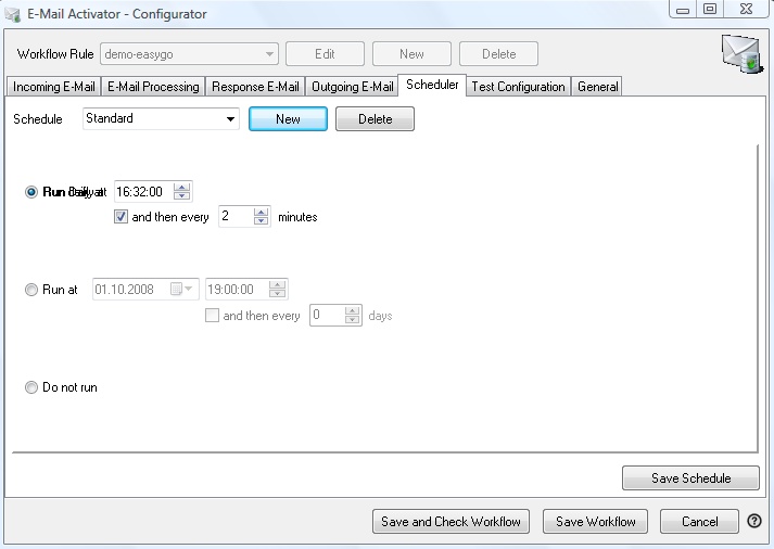 •Run daily at hour and then every x minutes. This starts the E-Mail Activator - Service at the specified time and then processes the E-Mails every x minutes