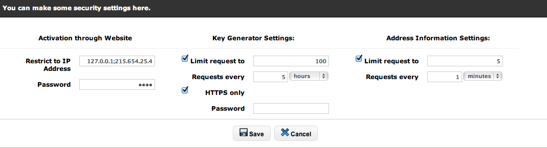 The Activation Server 4 allows to create keys through by an external application or through a web page. To ensure, that keys can be generated only from authorized web sites, you can either specify IP addresses (recommended) or a password. The settings apply to all pages which generates keys, e.g. Unlock Keys.