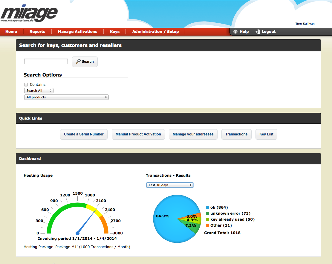 The search is a full text search - you can search for keys, company name, customer first or last name, reseller name or e-mail address. The search is even extended to the computer names (host name) within a transaction.
