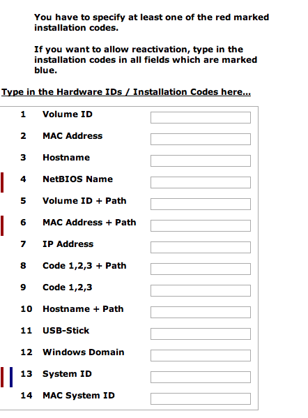 A blue bar indicates an installation code which is used to allow a reinstallation on the same computer (see example 2 above). Another way to handle reinstallations is that you have to provide a specific number of hardware codes (see example 1). The installation codes to allow a reinstallation are optional.