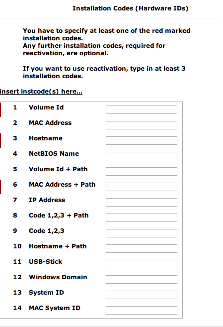 A red bar indicates an installation code which is used for copy protection. You have to provide at least one hardware ID which is marked with a red bar.