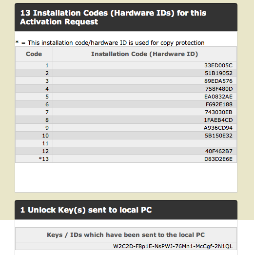 Below this section, you find additional information about Installation Codes and Unlock Keys. This information is only available for a product activation (Serial Number / ID).