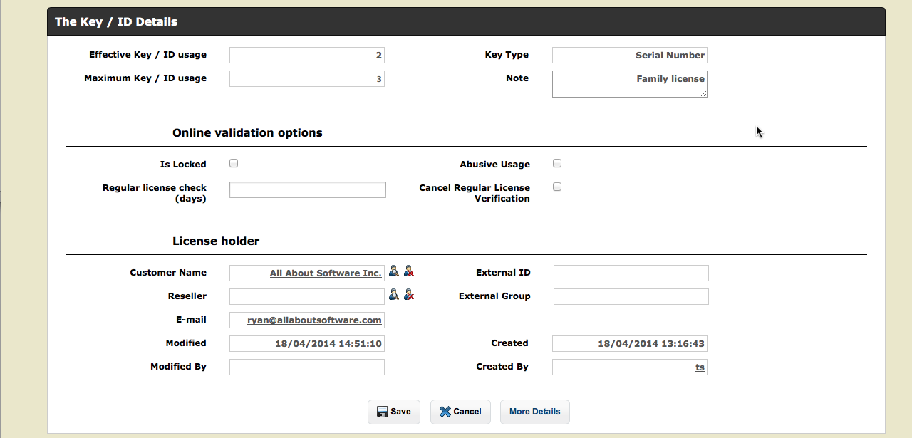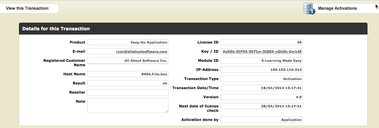 This part of the screen includes information about the Transaction like product name, IP address or the name and E-mail address which was typed in during the product registration. This data cannot be changed because it is like a record in a book-keeping application.