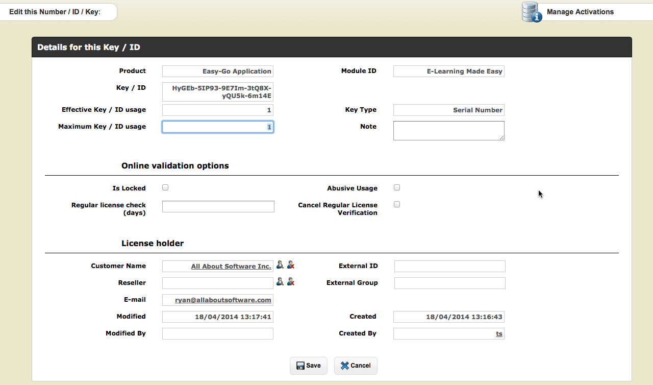This screen provides the key details and an overview of all transactions for one single Serial Number / ID / Activation Key.