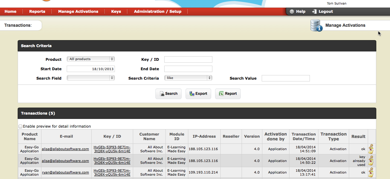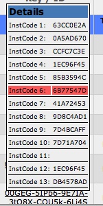 Search for a key / ID in the Home TAB and click on the search result in the Key List. You get an overview about all Transactions for this key. Hovering over each transaction displays the installation codes so that you can easily compare, if the key was used on the same machine or not (of course the Activation Server 4 has already done this).