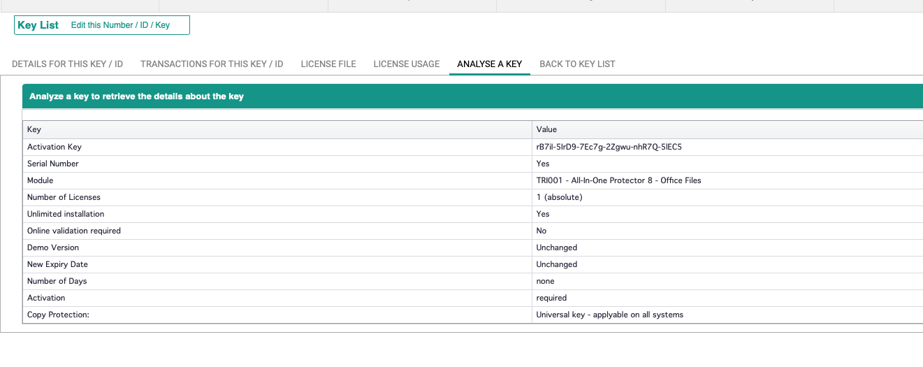Navigation: Activation Server > Tutorial Activation Server > Data Management > Key List > Key Details