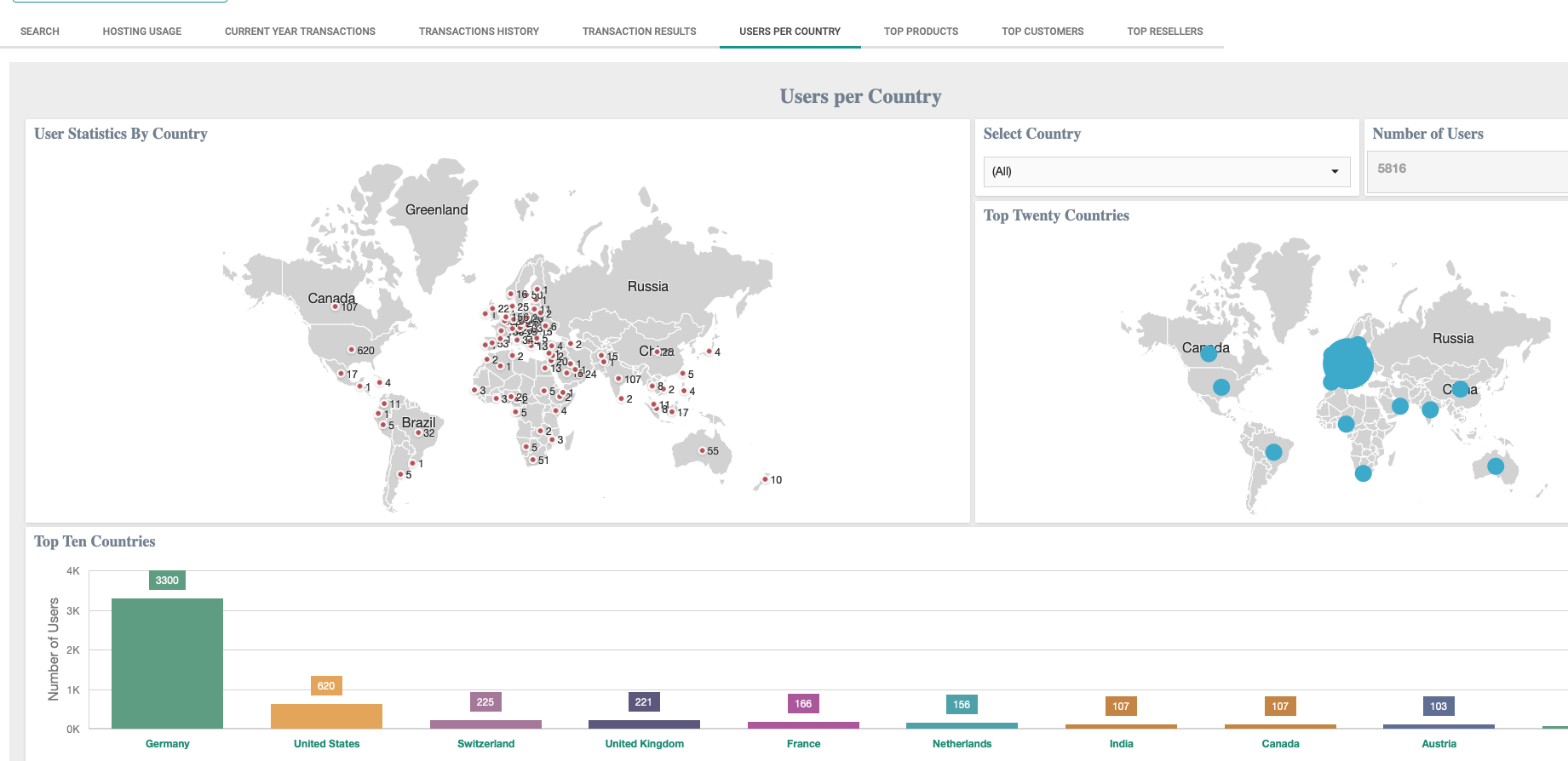 This dashboard shows a world map where your software is installed. As number of users the number of address entries is counted.
