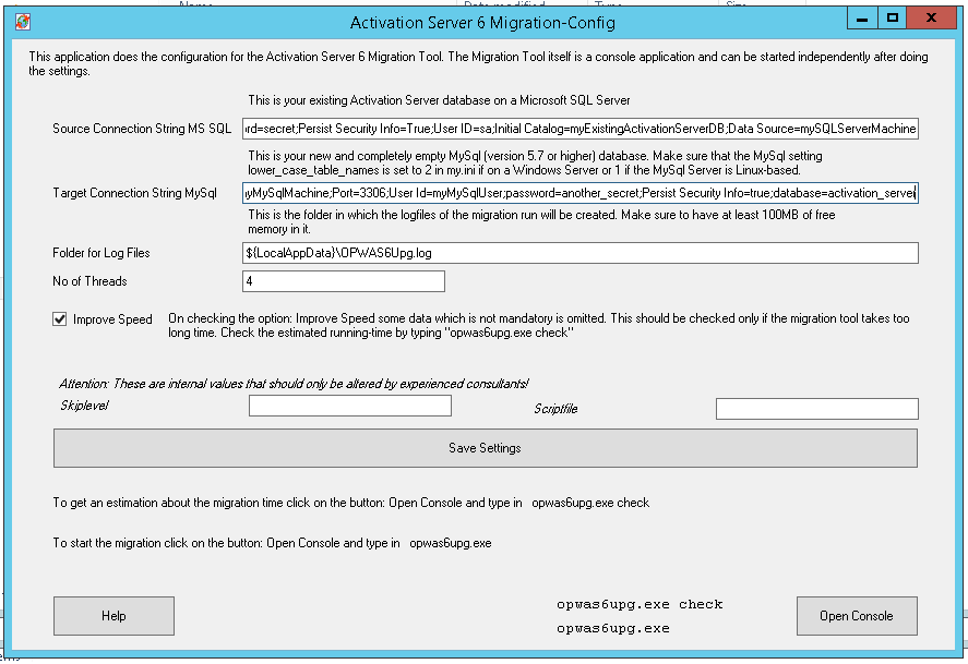 •Target Connection String My-SQL - this is the connection string to connect to the new My-SQL server database. The database may not include any existing activation server data (new installation)