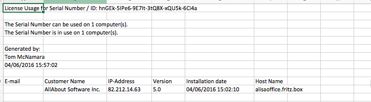 By clicking on the button Report, an Excel xlsx file is created. It creates a usage report and lists all computers, where the Serial Number was used.