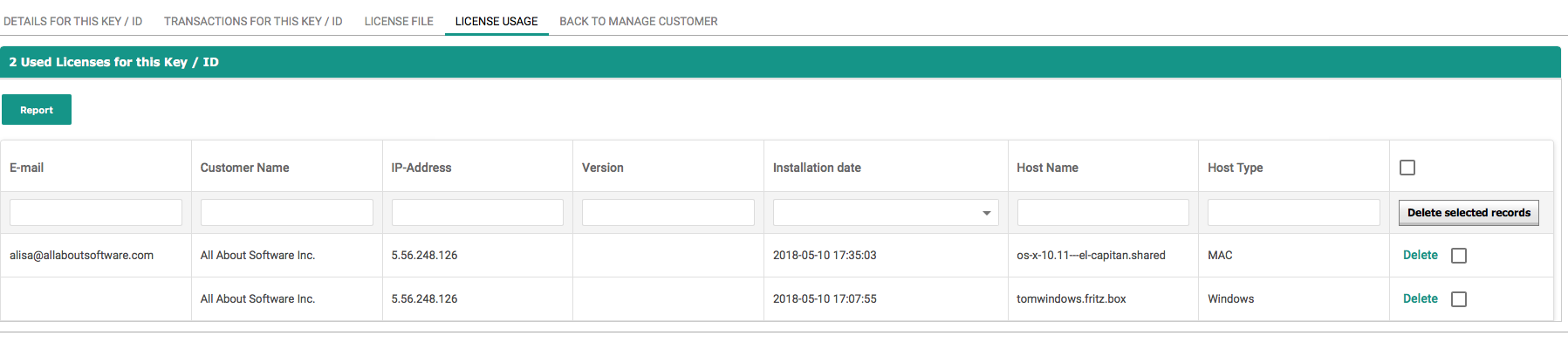 Click on the TAB License Usage to get an overview about all computers, where the product is installed. To identify a computer, the hostname or e-mail address as well as the operating system (Windows / Mac) can be used. If a manual product activation was done, the hostname is empty.