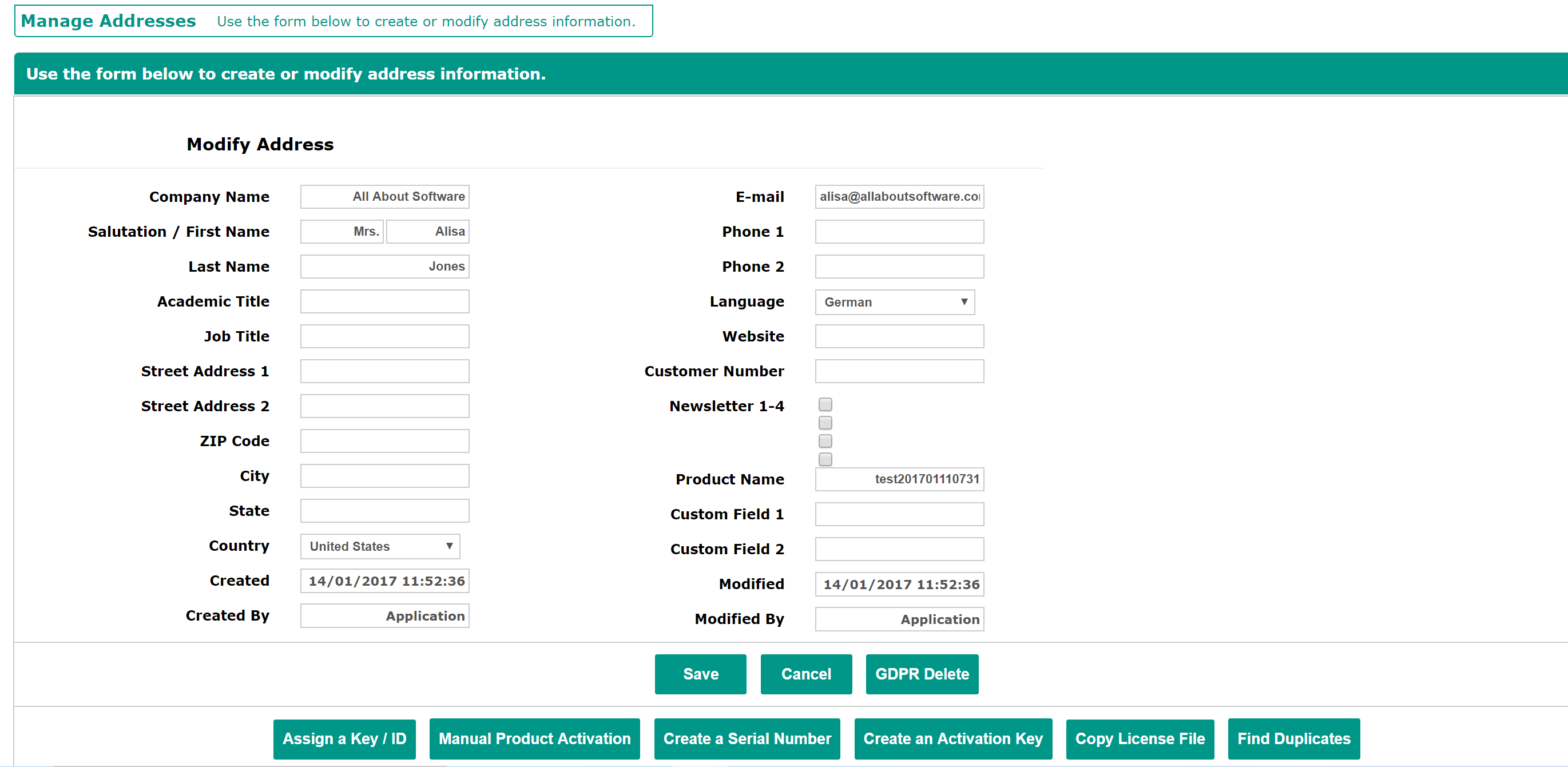 •The address can only be deleted, if there are no keys / IDs or license file assigned to this address or if the key / ID was never used before