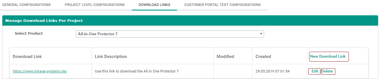 The download links configured in the download links section are visible to customer portal users in the license management section. Customer portal user can find the download links for the product and can download the products using the links directly. For details click here .