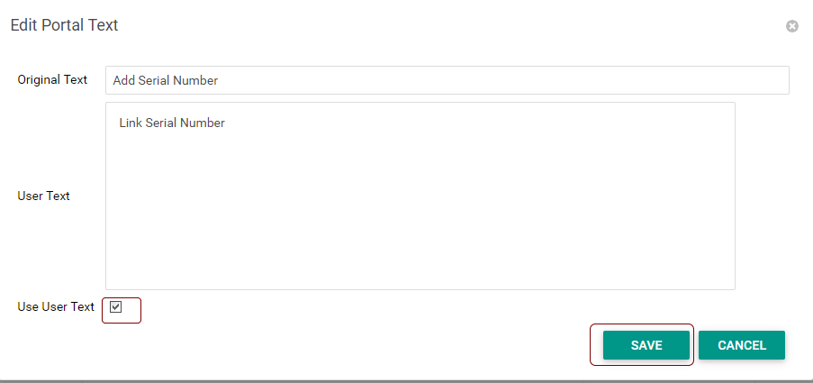 Click on Edit and configure user text and enable use user text to override the current text in the customer portal. Click on Save to save the changes.