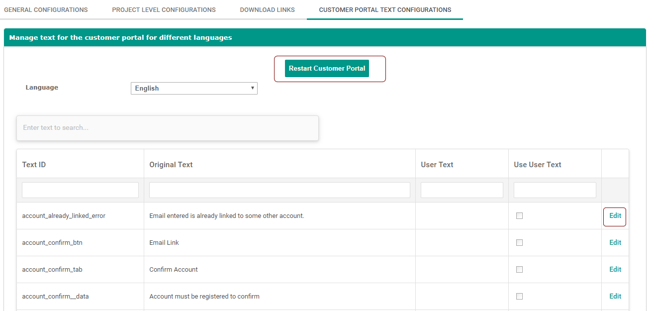 Restart the customer portal by clicking Restart Customer Portal button after changes to make the changes take effect in the customer portal.
