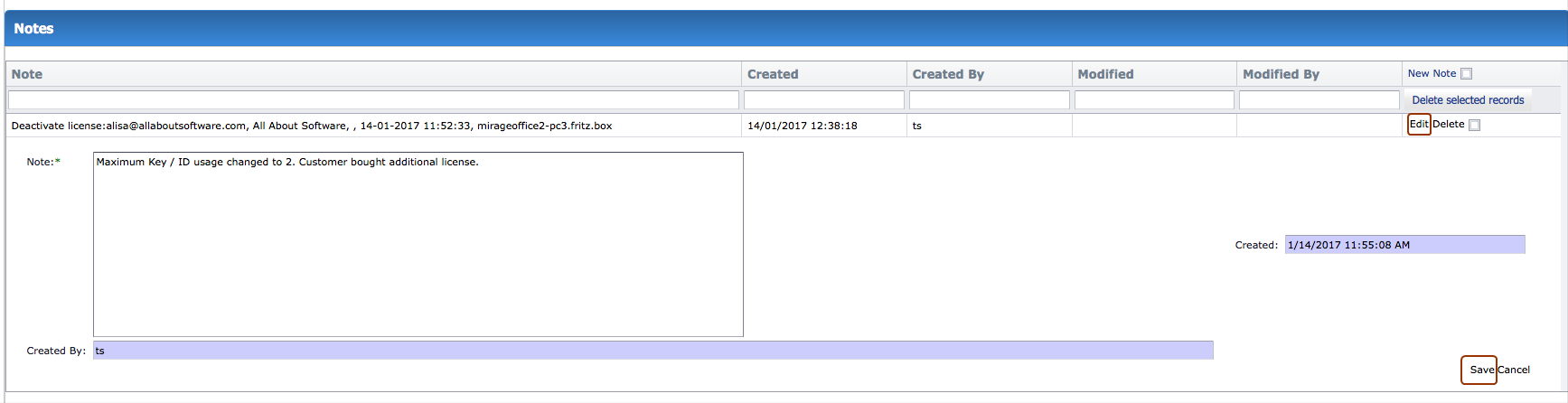 Changing specific values of a key will automatically create notes. This provides a complete documentation about who changed a key setting at what date/time.