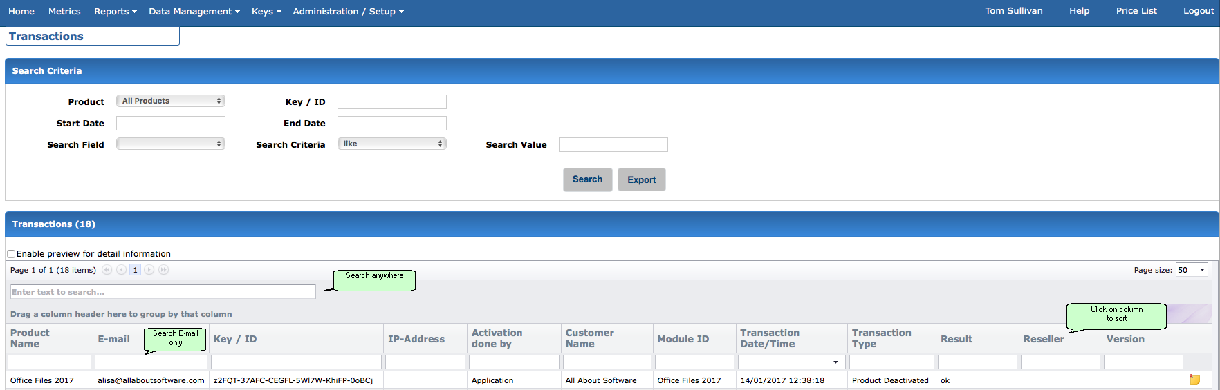 You can limit the result of the transaction list by either specifying Search Criteria like Start Date or select a product in the product picklist.