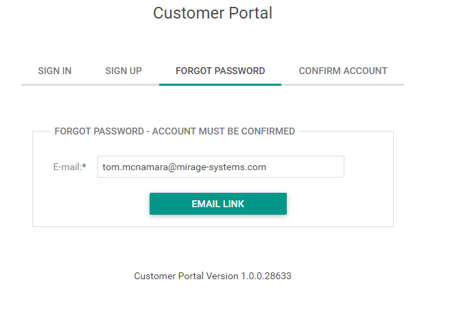 In case user does not get the account confirmation email or wants to do it at later stage, user can confirm the account using Account Confirm screen. Only after confirming the account, user is allowed to log in in the customer portal. User needs to enter the email id attached to the account used for registration and account confirm link is sent via email. User needs to click on the link in the email to confirm the customer portal account. For details click here .