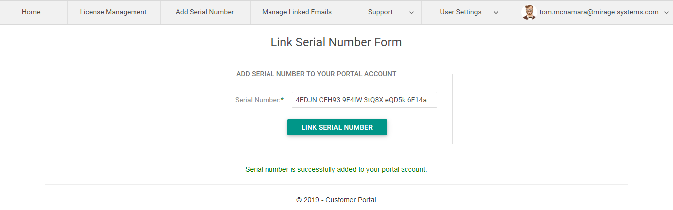 Click on the link serial number button to add the serial number to the customer portal account.