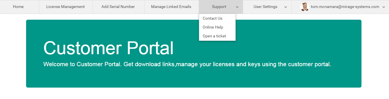 Support contains the sub menu for Contact Us, Online Help , Open a Ticket.