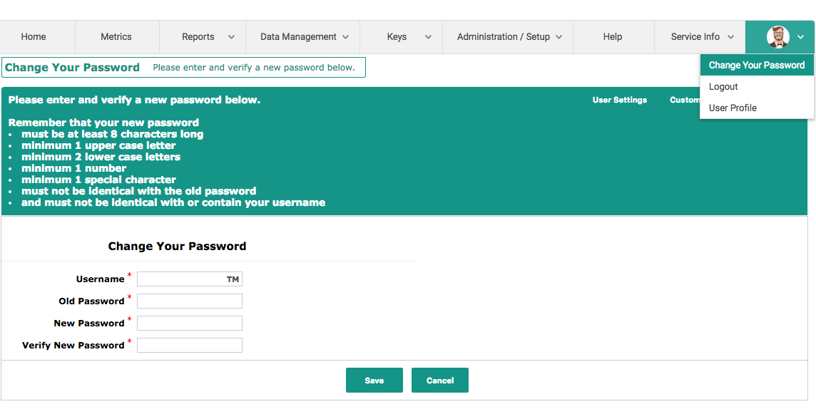 Each user can change his password by providing the old password and entering a new password which must meet certain conditions to generate a secure password. The password requirements are listed at the top of the screen.