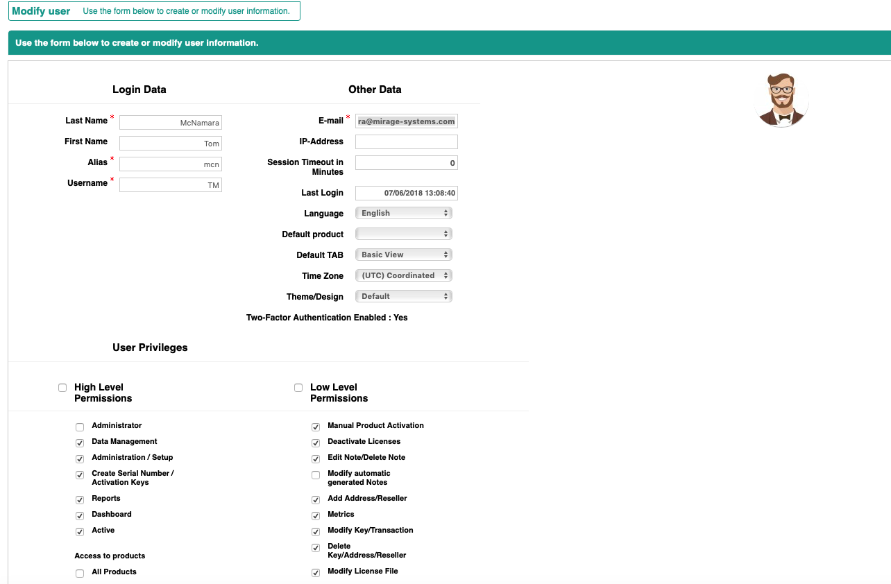 •Click on the link Individual products to select one or more products the user can access. The user can then only access the selected products. All features like search, create keys, reports are then limited to these products.