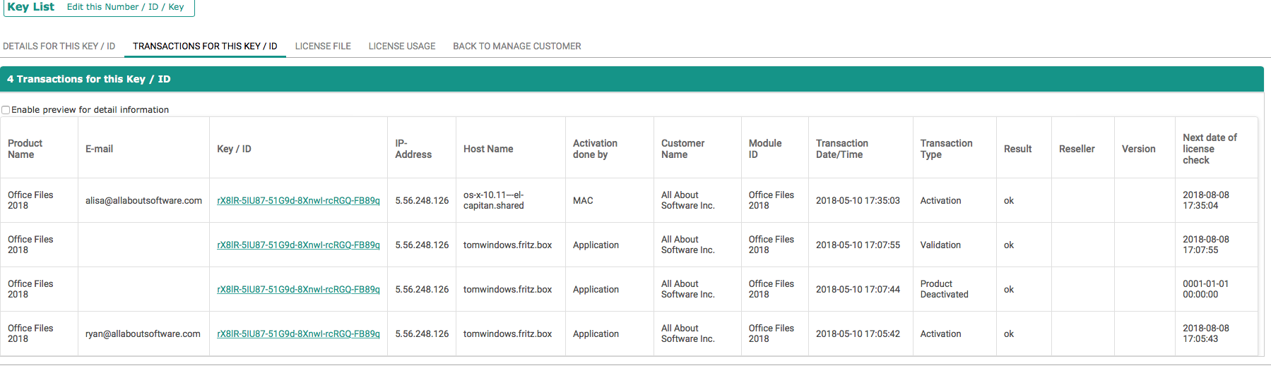 One single key can have multiple transactions - e.g. each time the key was used for a new installation or a regular online check was done, a new transaction for this key is generated. The transaction list gives you a complete history of the key usage.